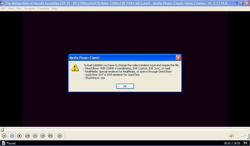 "Чтобы загрузить субтитры, вам нужно изменить тип видео renderer'а и заново открыть файл." Далее инструкция: