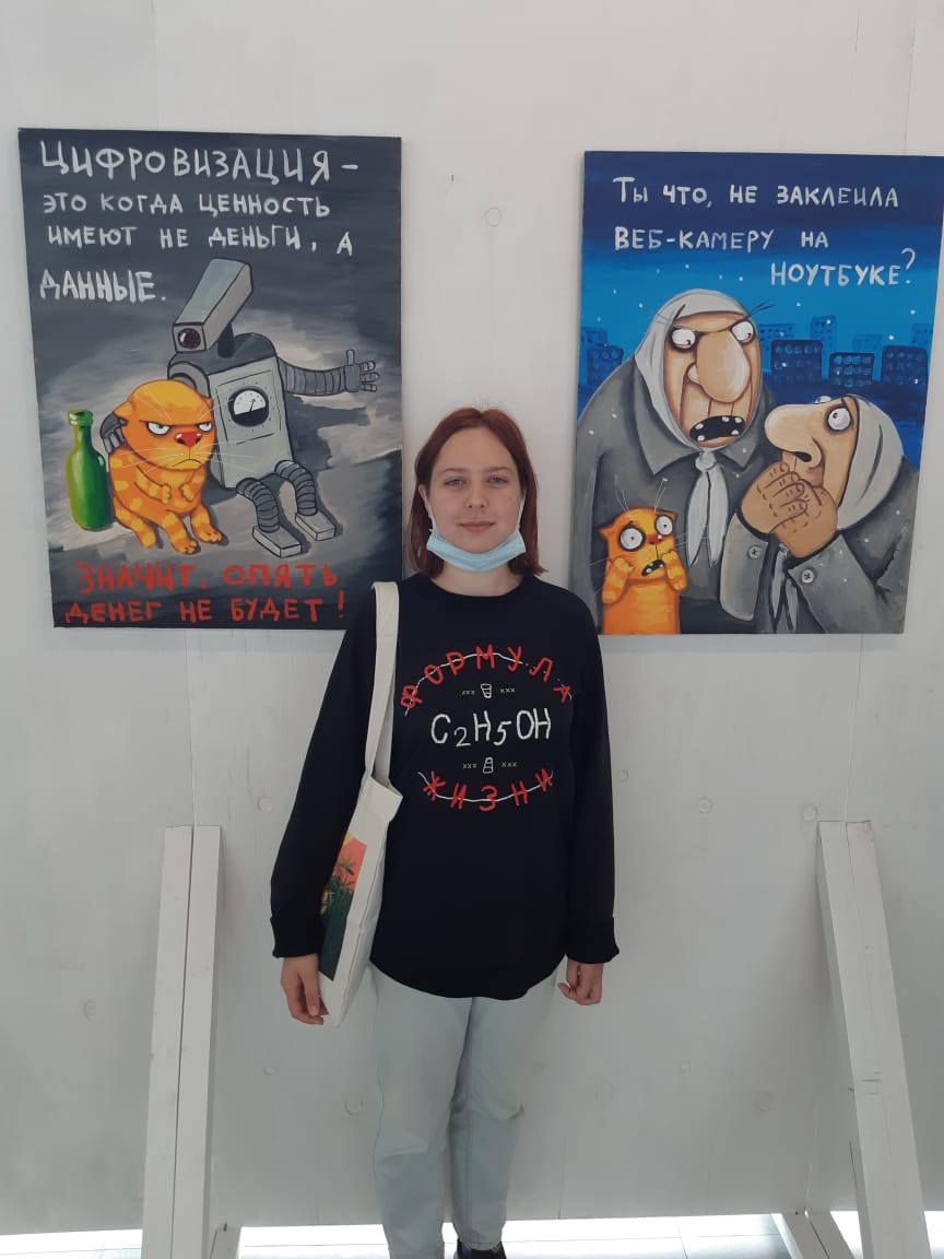 После просмотра фильма продолжили наши культурные мероприятия, отправившись на ХудВыставку православных картин маслом Васи Ложкина. Дитё от выставки осталось в полном восторге, на ней же затарились всяким васяложкинским мерчем типа той же сумки на плече дочи на фото (конопляный кот-наркот).