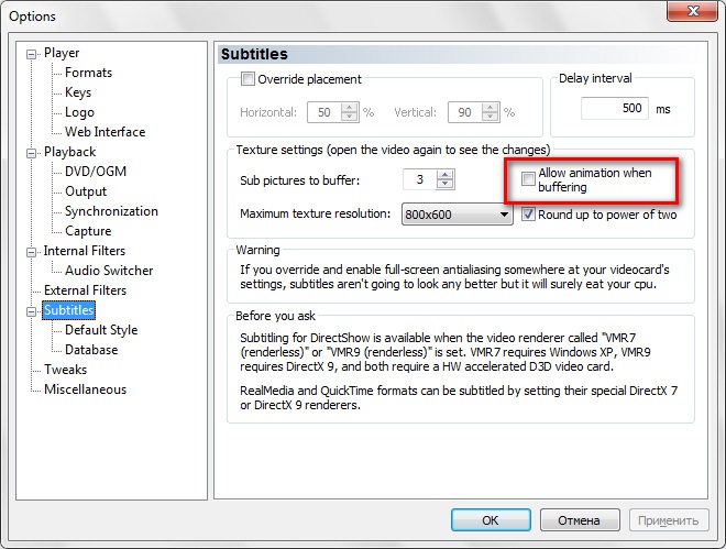 Вот с сабами тут другая проблема - надо использовать встроенный декодер в MPC-HC, иначе будут уже описанные выше рывки при появлении субтитров и общее подтормаживание видео. Но это только из-за недостатка мощности камня - дома у меня все идеально и с декодером от MS.