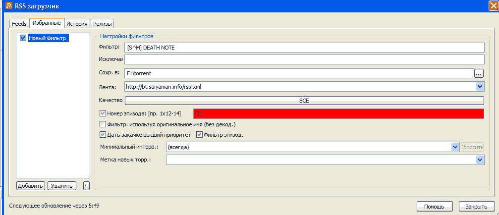 лента настроена, тут вот в чем дело, когда я ставлю *HorribleSubs*Tegami Bachi*09*480p* - закачивается девятая серия, но когда ставлю *HorribleSubs*Tegami Bachi*480p*, то ничего не закачивается.