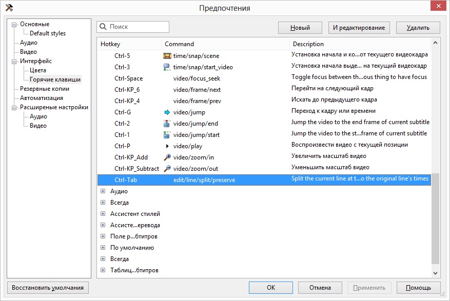 До этого через саму программу Aegisub команда почему-то добавлялась в раздел "По умолчанию" и собственно там и оставалась судя по файлу hotkey.json, но в самой программе не отображалась и не работала...